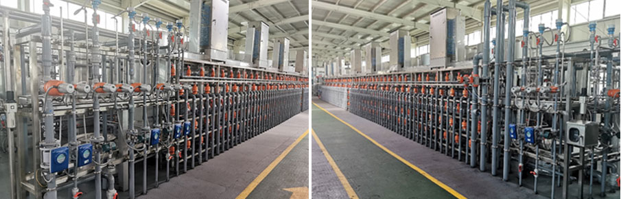 A fully automatic multi-unit ion exchange system uses the one-key start for easy operation. Acid, alkali, water, materials and the temperature can adjust themselves fully automatically. PH, conductivity and sewage discharge are all monitored on the line. It is enough for the workers to inspect the site.